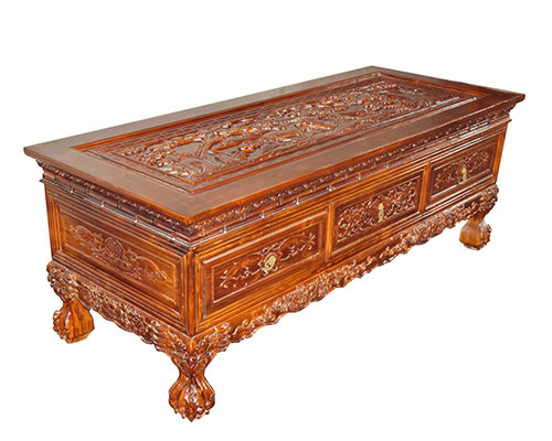 藏式茶几由西藏传统的佛堂供桌演变而来,大约在五世达赖时期基本定型,茶几是西藏传统家具中的一大系列,一般分为两种类型,即组装固定的家庭型和可折叠的携带型。前者体积较大,工艺及木料都很考究,往往将彩绘、雕刻、沥粉贴金等工艺融入其中。其纹饰大多富丽繁华,宗教色彩浓厚,常把具有藏教神话色彩的佛像、怪兽、花鸟、走兽等通过大胆的构思、鲜艳的色彩和华丽的装饰绘于其上,从而形成了独具一格的藏式古典家具。常见的纹饰还有螭龙纹、瑞兽纹、植物纹、雷云纹、几何纹等,纹样大都与财富、吉祥有关。具有浓厚的民族风格与独特的艺术特色。