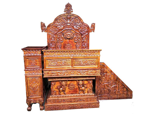 它是活佛或德高望重的高僧诵经讲法的宝座。其背部边缘是由祥云卷草和六种生灵雕像重叠装饰,即妙翅鸟:表示慈悲之相;龙女:表示救度之相;大鳌:表示保护之意;孩童:表示资福之相;独兽角:象征自在之相;巨象:意为善师。