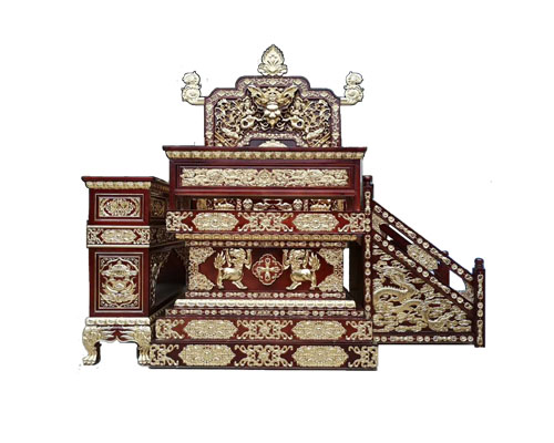 藏式家具在造型.上古朴华丽,尤其是金属装饰品使其具有一番豪华气派。在装饰手法上别具一格,丰富多彩,大体包括:彩绘、珠宝镶嵌(松石、珊瑚石、猫眼石等)、铁尖钉封边、木群边及雕刻、兽皮镶嵌等。其中非常具民族特色的装饰手法,当数兽皮镶嵌。